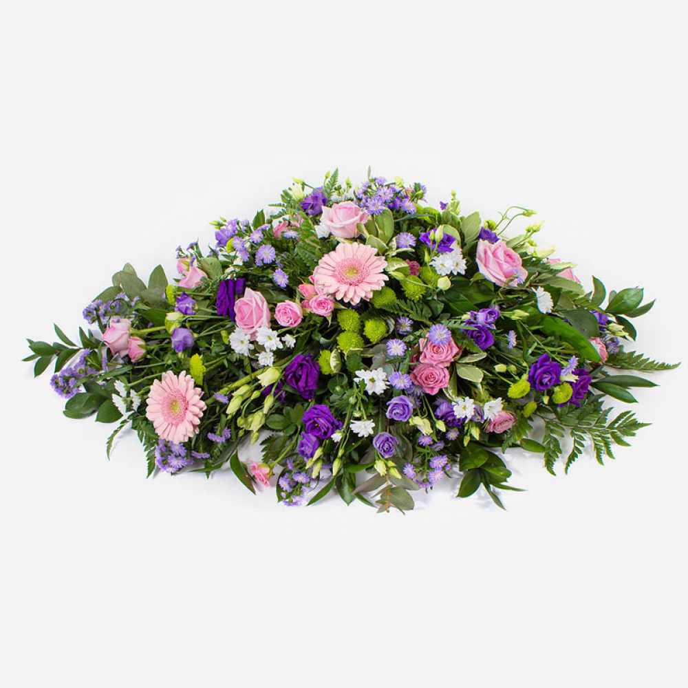 Purple & Pink Single Ended Spray. Approx 75cm long / 45cm width. *Fine Print: Every product is hand made and delivered by the local florist. Pictures shown are recent examples of an actual arrangement that was designed by talented florists! Please note that each individual florist cannot guarantee what the flower varieties or colours will be (unless specified on the product description), they will guarantee that your specific arrangement will be fresh and beautiful.